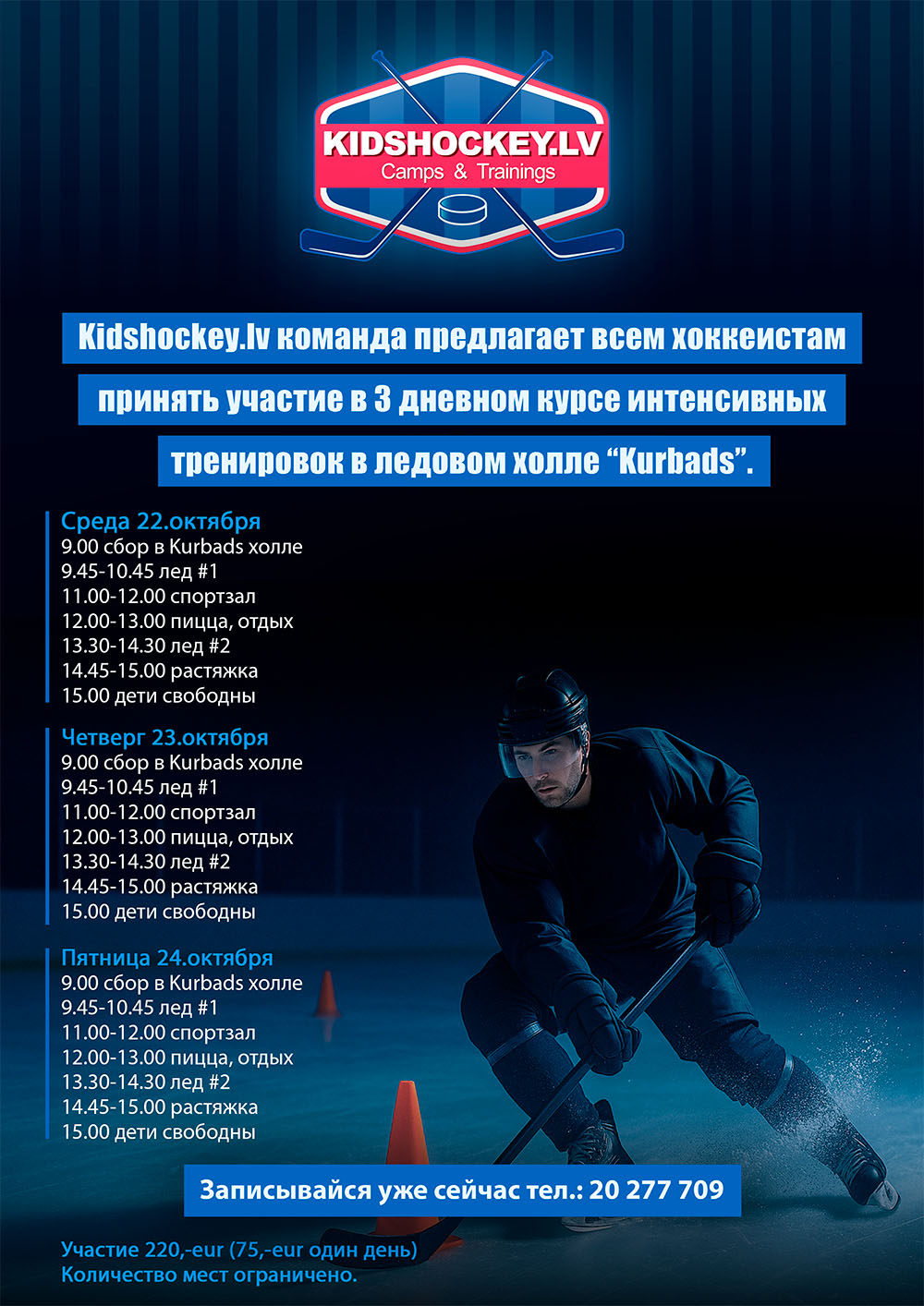 Во время осенних школьных каникул. Kidshockey.lv команда предлагает всем хоккеистам принять участие в 3 дневном курсе интенсивных тренировок в ледовом холле “Kurbads”.